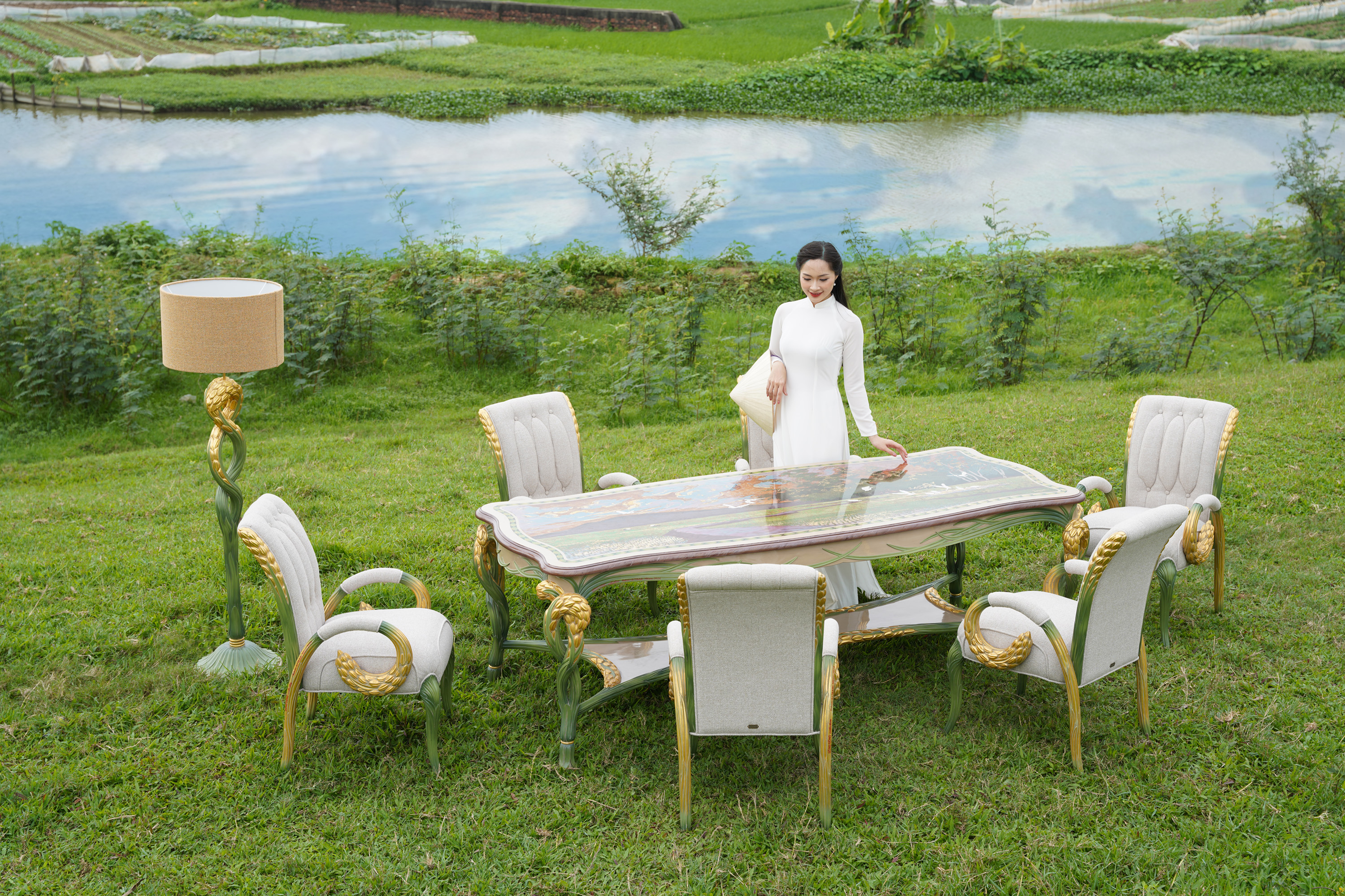 Ấn tượng và sáng tạo trong bộ sưu tập là hình ảnh cách điệu từ bông lúa non được chạm khắc tỉ mỉ, dát vàng điểm xuyết màu sơn đặc biệt - màu của đồng nội nhẹ nhàng quyến rũ. Ngôn ngữ thiết kế này tiếp tục được "phá cách " trong các sản phẩm nội thất khác,